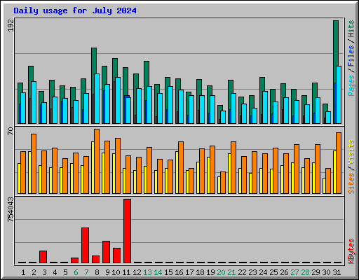 | Day | Hits | Files | Pages | Visits | Sites | KBytes | ||||||